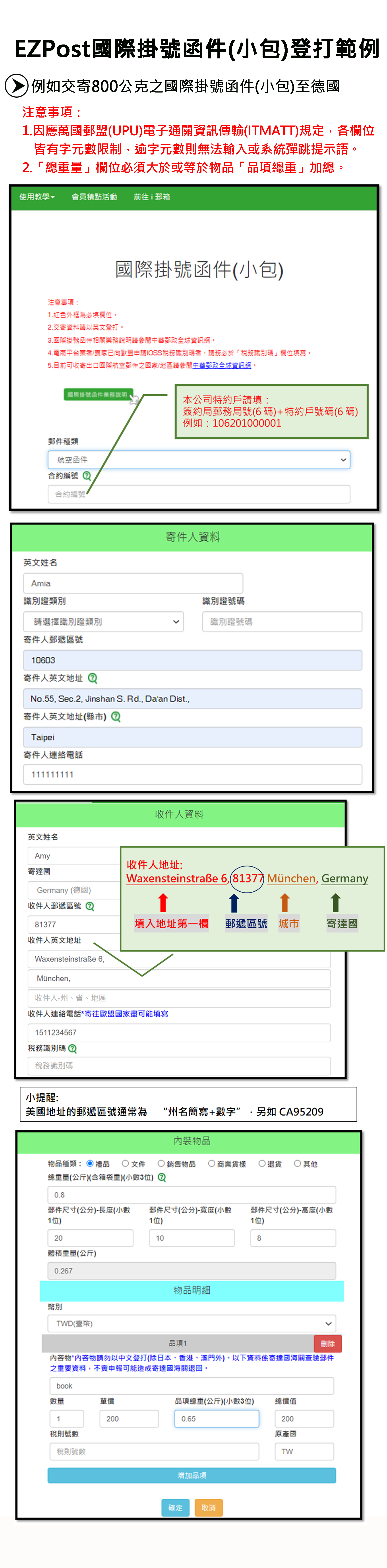 以下紅色的地方要填寫,超過2公斤的話不能寄e小包喔!